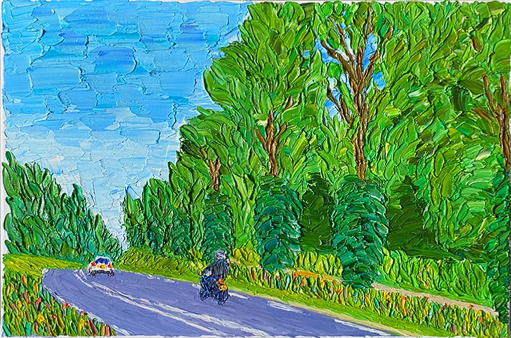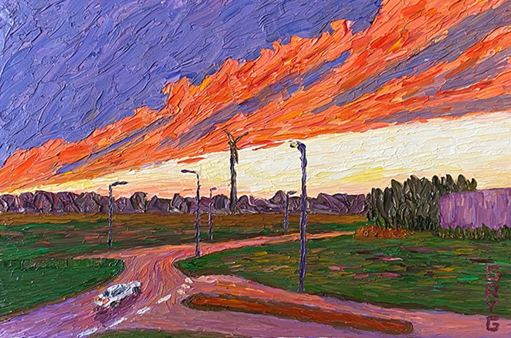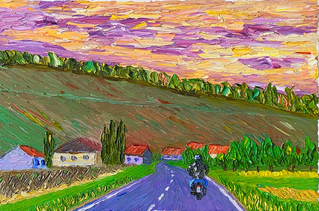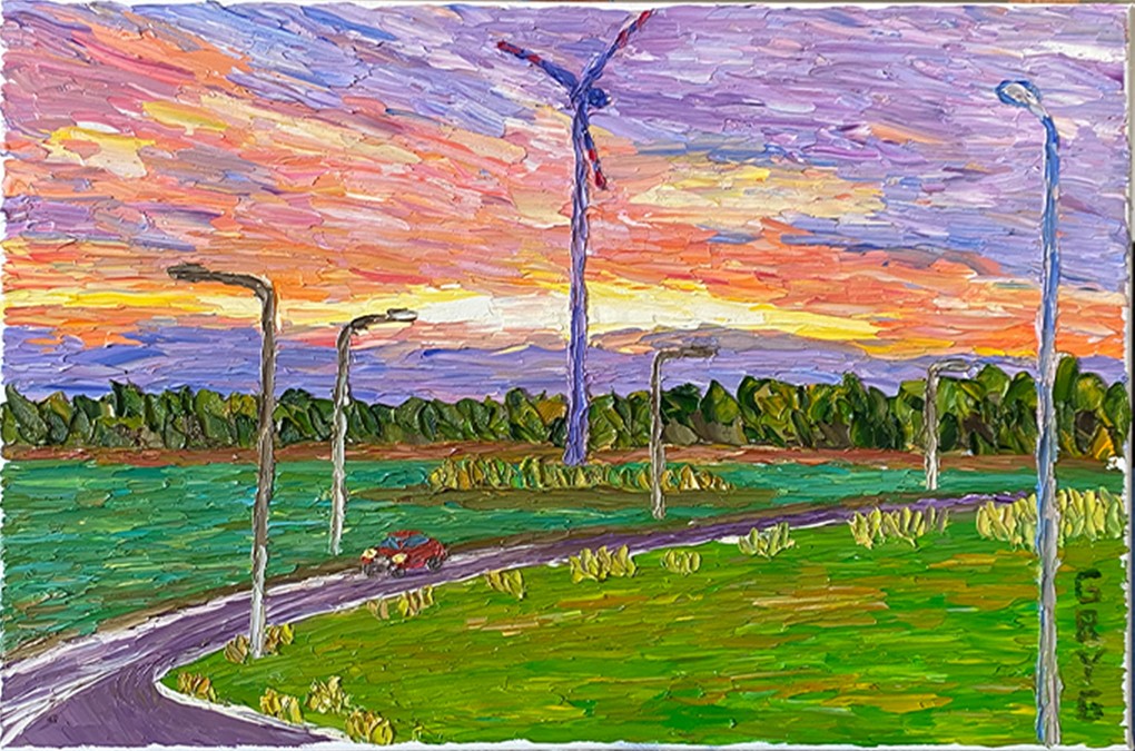 Elk schilderij vangt het moment waarop licht en duisternis elkaar ontmoeten, wanneer de dag plaatsmaakt voor de nacht. De kunstenaar laat niet alleen de schoonheid van de hemel zien, maar ook de kracht van contrast: beweging en stilte, licht en schaduw, de snelheid van de weg en de eeuwigheid van de horizon.