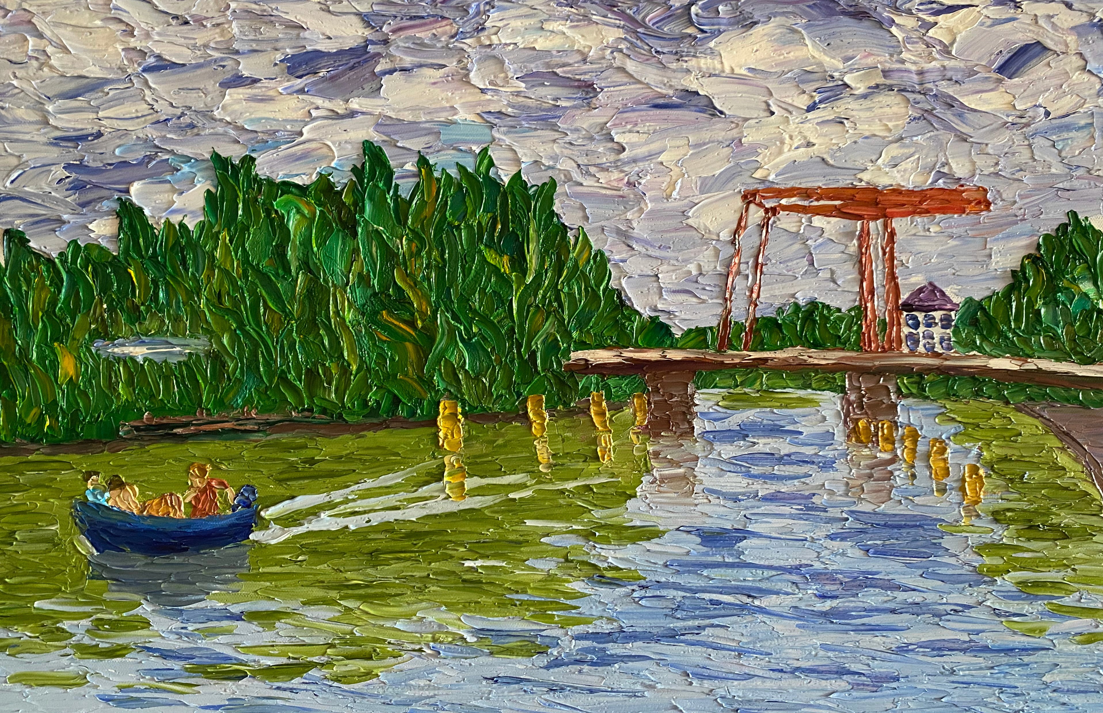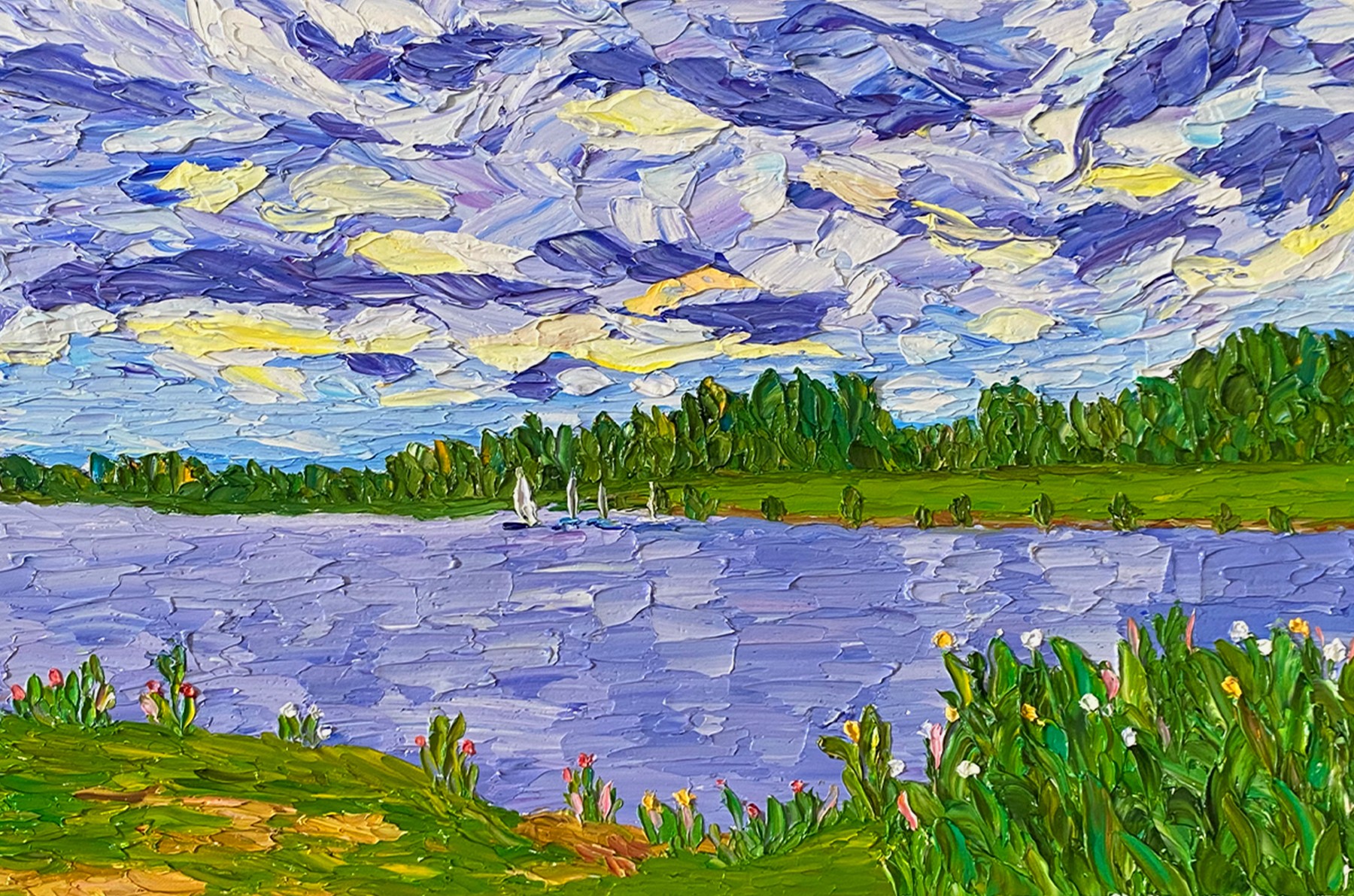 Elk schilderij ademt beweging en de adem van de natuur: de wind speelt in de kruinen, wolken trekken snel voorbij, het licht verandert van minuut tot minuut. De dikke verfstreken geven een gevoel van directheid – alsof het doek ter plekke werd geschilderd, terwijl de hemel nog in vlammen staat en de rivier schittert in het licht.