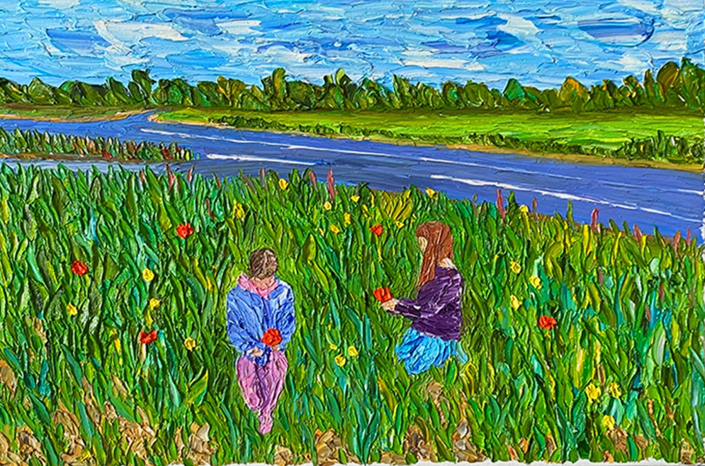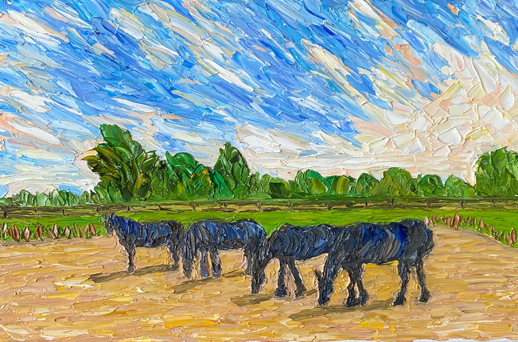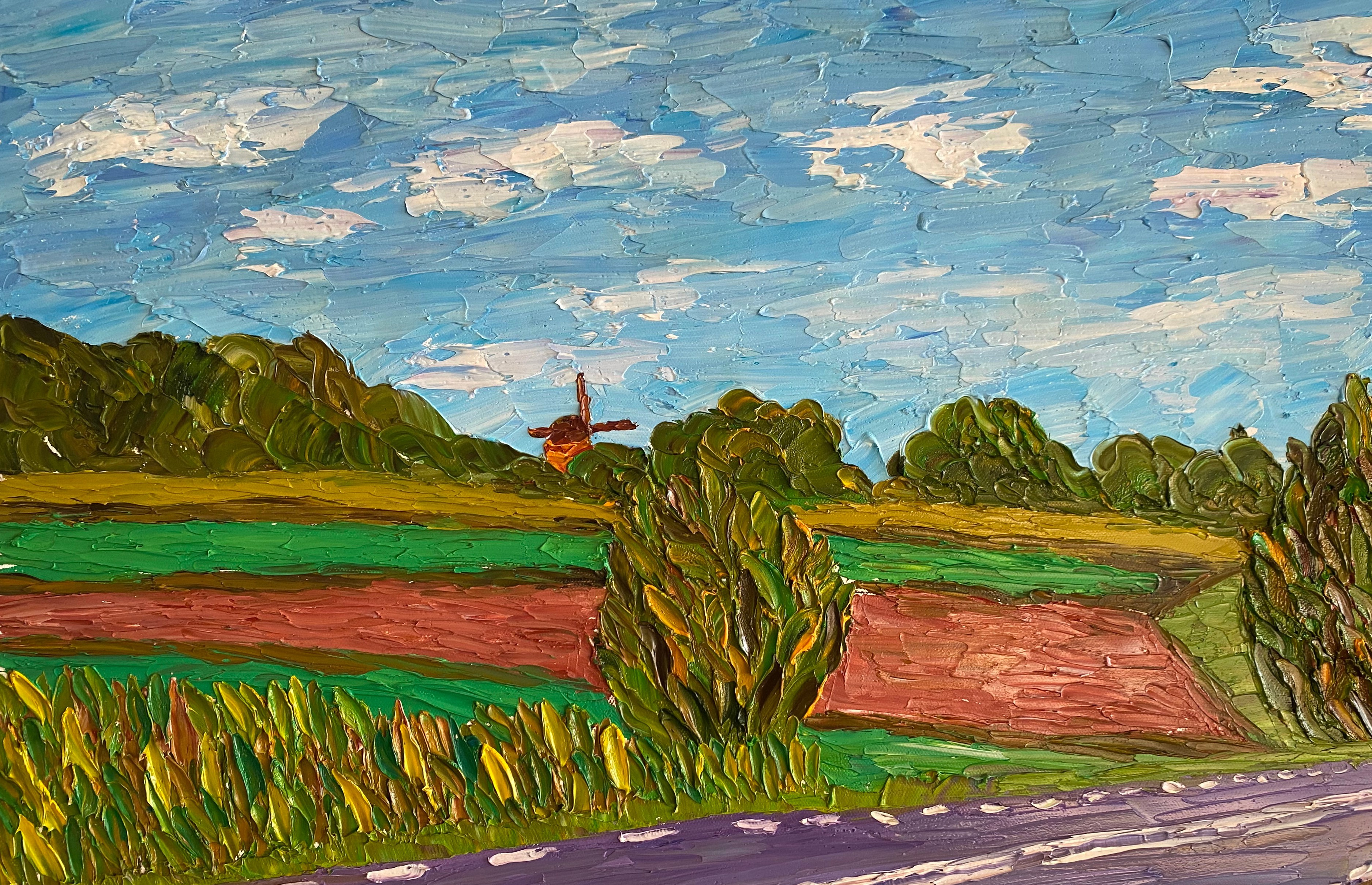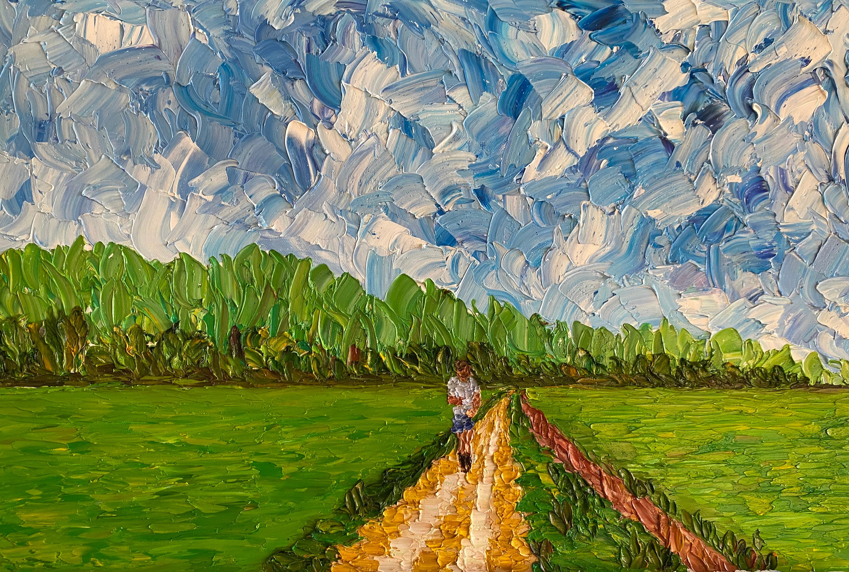 De schilder vangt de sfeer van een rustige dag: een ochtendwandeling door het veld, het zachte gezoem van insecten, en wolken die voortdurend van vorm veranderen. De frisse kleuren van het gras en de open lucht vullen elk doek, terwijl de dikke penseelstreken een tastbare levendigheid oproepen. Als toeschouwer word je bijna het landschap ingezogen – je voelt de wind, hoort het verre geluid van een klok en ziet hoe de horizon voortdurend verschuift.