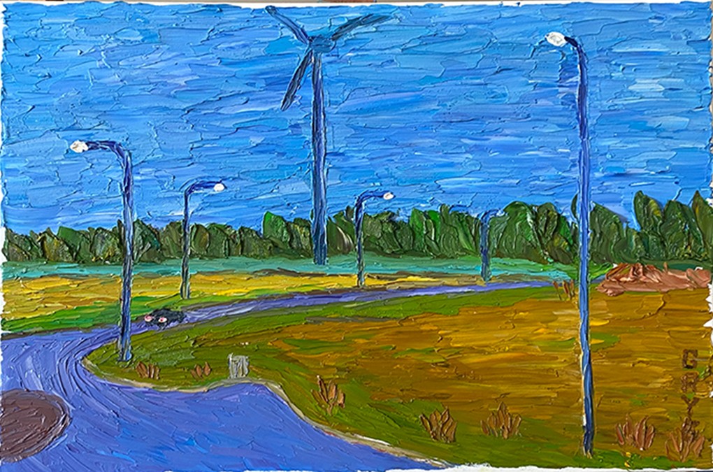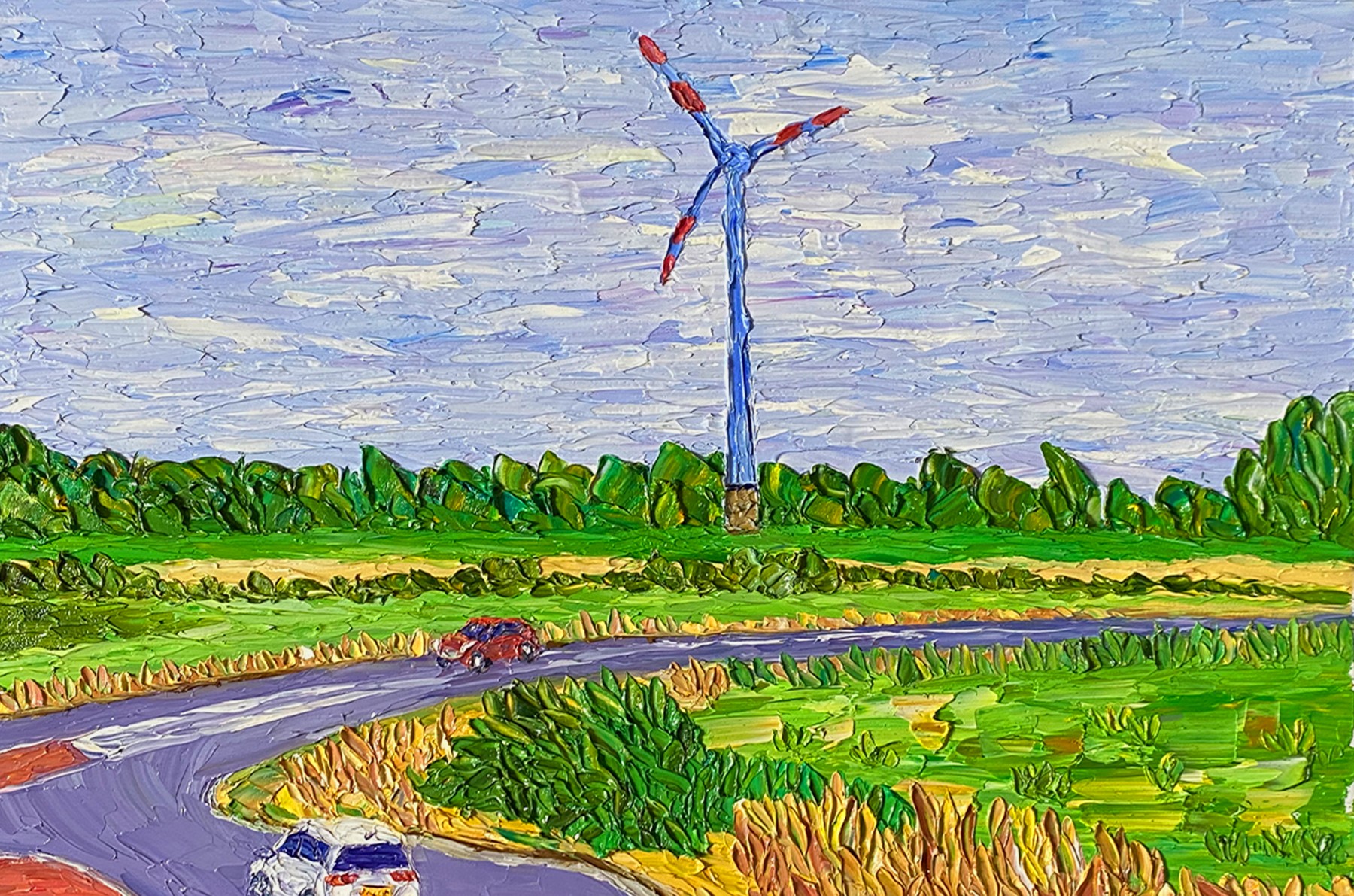 De collectie Brandende Horizons ademt energie en drama. In deze werken veranderen zonsondergangen in vurige spektakels: wolken gloeien in brons en purper, de hemel lijkt te branden, terwijl wegen en straten verdwijnen in dit licht. Auto’s, motoren, lantaarnpalen en windturbines worden onderdeel van een landschap waarin natuur en mens samensmelten in één ritme.