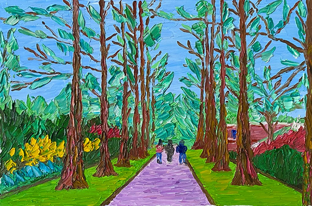 De collectie Een Wandeling gaat over de stille, lichte momenten waarin de weg zelf belangrijker is dan de bestemming. Hier komen alledaagse taferelen tot leven: kinderen die bloemen plukken langs de rivier, vrienden die samen door een laan wandelen, een fietser tegen de achtergrond van een vurige zonsondergang, of voorbijgangers in de schaduw van hoge bomen. De kunstenaar legt met warmte en aandacht de schoonheid vast van datgene wat we vaak over het hoofd zien in de haast van het leven.
