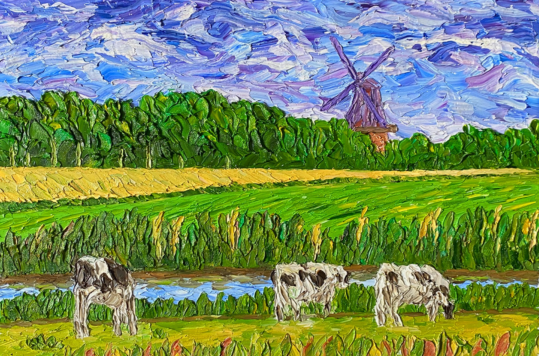 De collectie Het Landelijke Leven is een ode aan de eenvoudige schoonheid van het platteland in Nederland. Hier vinden we geen haastige gebeurtenissen of dramatische verhalen, maar juist stilte, harmonie en de rust van het dagelijks bestaan. Uitgestrekte velden, grazende koeien en paarden, de vertrouwde vormen van oude molens en de moderne windturbines – ze worden allemaal symbolen van een tijdloos ritme waarin verleden en heden samenkomen.